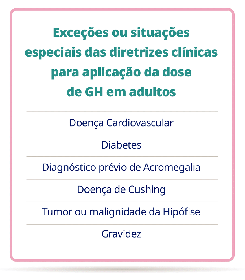 As diretrizes clínicas atuais recomendam estratégias personalizadas de titulação da dose com baixas doses iniciais e o uso total de IGF-I como um biomarcador bioquímico para a titulação da dose de GH em adultos. Exceções ou situações especiais podem incluir pacientes com doença cardiovascular, diabetes, diagnóstico prévio de acromegalia, doença de Cushing, tumor ou malignidade da hipófise ou gravidez