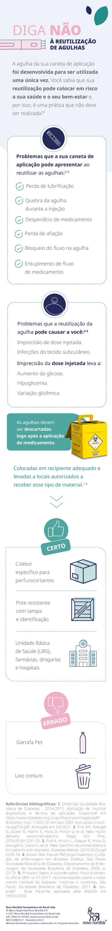 A agulha da sua caneta de aplicação foi desenvolvida para ser utilizada uma única vez. Você sabia que sua reutilização pode colocar em risco a sua saúde e o seu bem-estar e, por isso, é uma prática que não deve ser realizada?¹